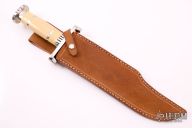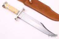 This large Draper style Bowie by Steve Voorhis features a mirror polished clip point blade with sharpened top edge, .246" blade stock, 1.980" blade depth. Hidden tang construction, with nickel silver guard and pommel, nickel silver spacers and escutcheon, and ivory paper micarta grip. Great feel in hand. Has a few light scratches, otherwise excellent condition. Comes with a brown leather sheath.