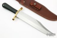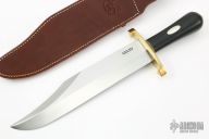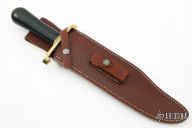This Model 12-11 Smithsonian Bowie by Randall Made Knives features a satin finished carbon steel blade with sharpened top edge, .327" blade stock and 2.147" blade depth, hidden tang construction. The handle has a lugged brass guard, fileworked brass butt and collar with a black linen micarta grip and nickel silver escutcheon. Comes with a brown leather sheath. Excellent condition.