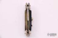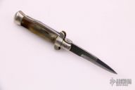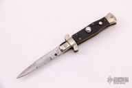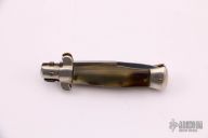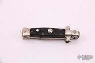 This pick lock auto by Latama is vintage. It features a bayonet ground blade with a false top edge. The handle has nickel silver guard and rear bolster and buffalo horn scales, brass liners, steel backspacer with round lock tab. Has nickel silver button and safety. Has some scratches, has a crack in the front scale, has some minor oxidation, has a little vertical blade play, fair condition.