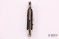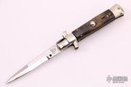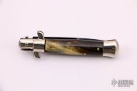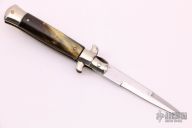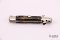 This 6.25" picklock auto by M. Mogal of Italy, it features a mirror polished and bayonet ground blade. The handle has nickel silver bolsters, front and rear, buffalo horn scales, D-stamped brass liners, stainless spring. Has some light scratches and a small crack in one of the scales, has some blade play, otherwise good condition for its age.