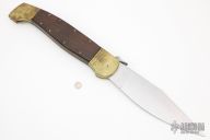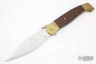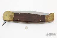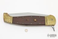 This 30" Lever release features a satin finished blade with notched thumbrest. The handle has brass bolsters, wood scales, brass liners and stainless steel backspacer. Has brass push button with safety. Has some scratches, otherwise excellent condition. Great function!