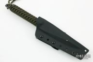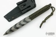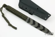 This KH by Strider features a tiger striped double-edged chisel ground blade with hollow ground back side, .271" blade stock and .974" blade depth, full tang construction with paracord wrap. Comes with a kydex sheath with TekLok. Has some sheath marks, otherwise excellent condition.