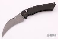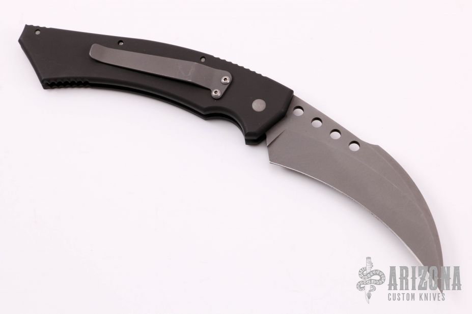 This Hawk Auto from Microtech has a bead blasted hawkbill blade. Handle is black anodized aluminum with bead blasted titanium tip down clip. Action is quick and strong. Excellent condition. Dated 9/96. Has a few light scuffs, otherwise excellent condition.