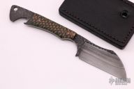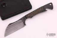 This Lime Cutter by Charles Roddenberry features a 1095 blade with dirty hamon and knapped finish flats, .124" blade stock and 1.044" blade depth, full tang construction. The handle has green spruce cone scales with brass pins, extended tang with bottle opener and lanyard hole. Comes with a black leather sheath. Excellent condition.