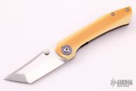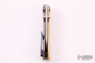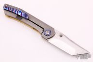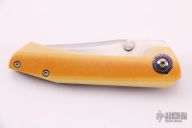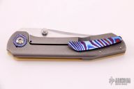 This Primo by Brandon Corbin Steel Wrx features a hand rub satin funish blade with false top edge and dual thumbstuds. The handle has an orange peel titanium frame, westinghouse micarta scale, with mokuti pivot collars, and tip up clip. The backspacer is zirconium. Comes with COA dated 4/20 and zipper case. Has some scratches, on the clip and frame otherwise great condition.