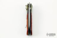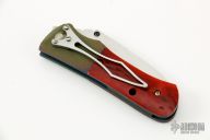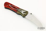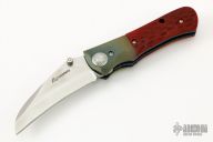 This Parakeet linerlock by Allen Elishewitz features a chisel ground hawkbill satin finished blade with notched thumbrest and single thumbstud. The handle has dovetailed and anodized titanium bolsters, red jigged bone scales, black G-10 backspacer, anodized titanium liners and a tip down stainless steel clip. Nice detent, lockup and blade seating. Has some light scuffs, otherwise excellent condition.
