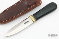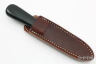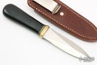 This Model 24 Guardian by Randall Made Knives features a satin finished double-edged blade with notched finger rests, .163" blade stock and 1.005" blade depth, hidden tang construction. Black linen micarta grip with black/brass spacers and a brass guard. Both edges of the blade are sharpened with 1" of thumb notches. This model was designed in 1978 for use by police, undercover agents and law enforcement personnel for self-protection and as a back-up weapon. Comes with a brown leather sheath w/ boot clip. Excellent condition.