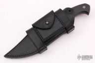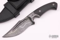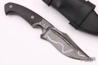 This magnum from the Sobral Brothers features their Damascus steel that has been forged into a beautiful finished product. It has a clip point recurve blade with a fuller and false top edge, .257" blade stock and 1.507" blade depth, full tapered tang integral construction. The handle features carbon fiber scales with laser engraved pins. Comes with a black leather sheath and a leather zippered case. New from maker.