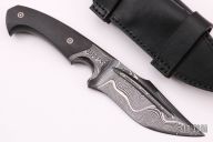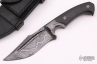 This magnum from the Sobral Brothers features their Damascus steel that has been forged into a beautiful finished product. It has a clip point recurve blade with a fuller and false top edge, .257" blade stock and 1.507" blade depth, full tapered tang integral construction. The handle features carbon fiber scales with laser engraved pins. Comes with a black leather sheath and a leather zippered case. New from maker.