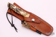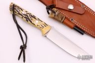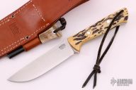 This Bravo-1.25 LT by Bark River Knives features a satin finished blade with .218" blade and 1.170" blade depth, full tang construction. The handle has stag jigged bone scales with aluminum pins. Comes with a brown leather sheath with a fire steel with sheep horn handle. Excellent condition.