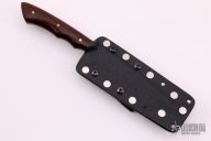 This knife by Master Smith Murray Carter features a hand forged blade made with Hitachi Blue Steel core laminated between Hitachi White steel. This steel affords the keenest possible edge. The handle has brown burlap micarta scales with black canvas micarta liners and brass pins. .124" thickness with a 1.320" blade depth, full tapered tang. Comes with kydex sheath with TekLok. Has some sheath scratches, otherwise excellent condition.
