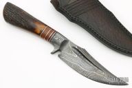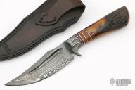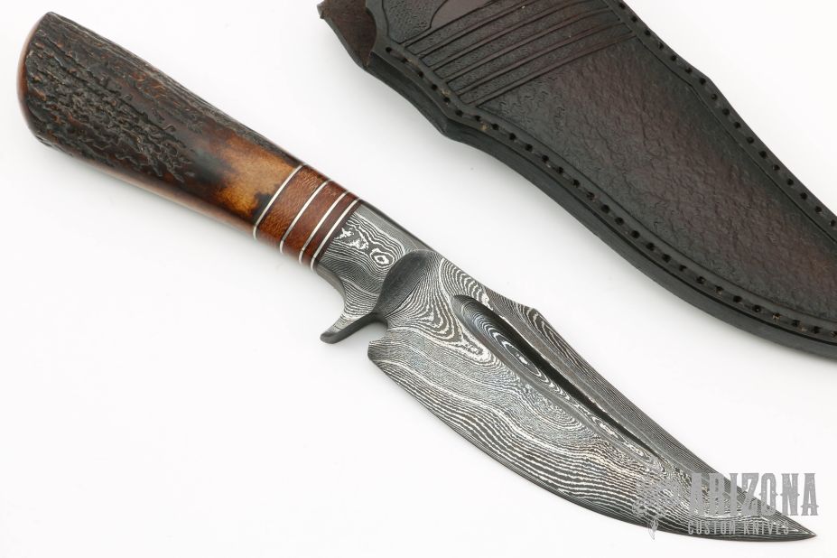 Another absolutely stunning piece from the Sobral brothers! This Hummingbird features a Damascus clip point blade with false top edge and deep fullers, .35" blade stock and 1.33" blade depth, hidden tang construction. The guard is integral to the blade, with a beautiful stag grip, nickel silver and micarta spacers. This piece comes in an equally impressive, hand tooled, brown leather sheath and a leather zippered case. New from maker.