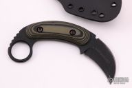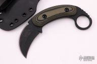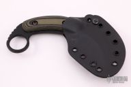 This Combat Karambit by Shadowtech Knives features a black powder coated blade with sharpened top edge, .209" blade stock and 1.258" blade depth, full tang construction. The handle has green/black G-10 scales with black screws. Comes with kydex sheath with belt loop. Excellent condition.