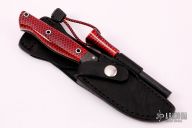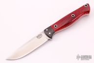 This Gunny Hunter by Bark River Knives features a satin finished blade with .156" blade stock and .929" blade depth, full tang construction. The handle has carbon fiber bolsters, red C-Tek scales with white liners. Comes with a black leather sheath with a matching fire steel. Excellent condition.