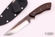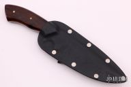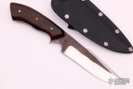 This Knife by Jamison Chop was an Apprentice under Master Smith Murray Carter, it features a two-tone San Mai blade with .160" blade thickness and 1.194" blade depth, full tapered tang construction. The handle has desert ironwood scales with red liners, nickel silver pins. Comes with a kydex sheath. Has some light scratches, otherwise excellent Condition.