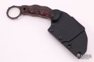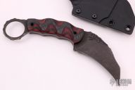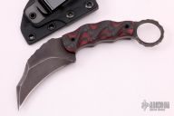 This Karambit by Half Face Blades features a chisel ground hawkbill blade with rock pattern blade spine and a dark tumble finish, .161" blade stock and 1.475" blade depth, full tang construction. The handle has contoured carbon fiber and red twill scales with black tube pins, ring at the butt with rock pattern tang. Comes with felt lined kydex sheath with belt clip. Excellent condition.