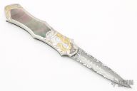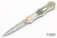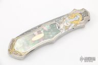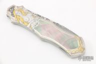This "Dolores" Auto by Rick Genovese was magnificently engraved by Jon Robyn. It features a Damasteel blade with false top edge and 7 gold pin inlays. The handle has a stainless steel frame with amazing engraving, gold inlays everywhere, beautiful hand rub satin finished all over. Has amazing black lip pearl inlays. Nice blade seating, nice strong action and lockup. Comes with a zippered case. Excellent condition. This is a truly extraordinary piece!