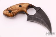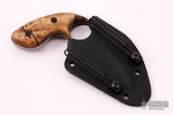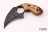 This Kodiak by BG Blades features a dark tumble finished double edged blade, .254" blade stock and 2.288" blade depth, full tang construction. The handle has box elder burl wood scales with black G-10 liners. Comes with a kydex sheath with belt clips. Excellent condition.