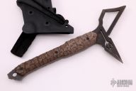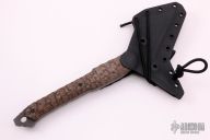 This Flintlock breacher war club by Half Face Blades features a dark stonewashed blade with spike on one end and club on the other, .216" blade stock, full tang construction. The handle has brown canvas micarta scales. Comes with a kydex sheath. Excellent condition.