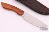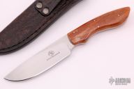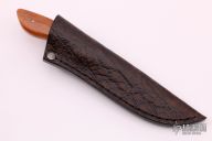 This knife is part of the "Predator Series" of knives by Arno Bernard. This piece has giraffe bone handle scales. Hand rubbed satin finish blade with .133" blade stock and 1.180" blade depth, full tapered tang construction. Includes a brown leather sheath. Excellent condition.