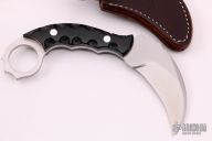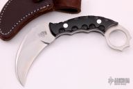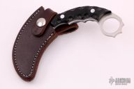 This Ghost Karambit by Bark River Knives features a satin finished hawkbill blade with false top edge and notched thumbrest, .185" blade stock and 1.293" blade depth, full tang construction. The handle has black canvas micarta scales and a ring at the butt. Comes with a brown leather sheath. Excellent condition.