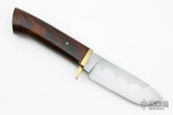 This Hunter by Tobin Smith features a hand rub satin finished blade with nice hamon, .158" blade stock and 1.420" blade depth, hidden tang construction. The handle has a brass guard and a desert ironwood grip. Excellent condition.