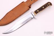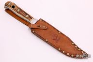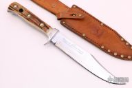 This Original Bowie by Puma features a satin finished blade with false top edge, .182" blade stock and 1.155" blade depth, full tang construction. The handle has an aluminum guard, stag scales and a lanyard hole at the butt. Comes with original brown leather sheath. Has been resharpened but it was done well, has a few light scratches, otherwise excellent condition.