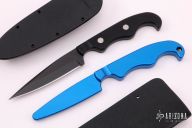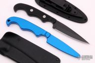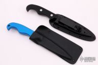 This RAT Training Package from Headhunter Blades was designed by Sayoc Kali Instructor Guy Harley Elmore. It includes a fixed blade, a trainer and front pocket sheaths with clips for both. The knife features a black oxide coated drop point blade with swedge, .129" blade stock and .783" blade depth, full tang construction. The handle is comprised of textured black G10 scales. The trainer is an exact replica of the live blade, with a couple small but important changes. The anodized blue color is a safety standard in military training. All inert training devices are blue. (blue guns, blue training knives, blue claymores, etc.) The tip of the RAT Trainer is 0.5"" shorter than the real blade. When you practice with a trainer, you touch your target with the tip but cannot enter the target. This shorter design builds an automatic half inch penetration into your targeting and negates the training scar created by using trainers. Includes pocket sheaths for both blades and original box. Excellent condition.