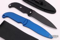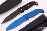 The Dirty is the Rat's big brother. It's full size grip is strong, sturdy and designed for someone who wants a little more in their hand than the Rat provides. However, like the Rat, The Dirty is easily carried and concealed, providing comfort and reliability in one package. This single edged blade offers a great mix of full sized use and ease of carry. The Blade At the five inches long this blade can easily reach all the vital targets of the body. Most from multiple angles. The width is just over one inch wide providing a wide wound channel and great leverage. Single edge is legal in most places and the false edge on top provides the all important point geometry necessary for ease of penetration through tough clothing or other materials. The Handle A strong wide grip provides safety and security to the user. The deep finger notch and the curved palm assist handle makes thrusting more secure and reduces the chances of riding the blade. The hook on the end of the handle provide a mechanical advantage when performing the drawstroke, making it faster and more secure. It also puts the blade in the Master grip, giving you the same grip from the draw, every time. The Trainer The trainer is an exact replica of the live blade but with a couple of small but important changes. The tip of the Dirty Trainer is 0.5 inches shorter than the real blade. When you practice with a trainer, you touch your target with the tip but cannot enter the target. This shorter design builds an automatic half inch penetration into your targeting and negates the training scar created by using trainers. The anodized blue color is a safety standard in Military training. All inert training devices are blue. (blue guns, blue Claymores, etc.) The Sheath Sheaths are custom Kydex with a proprietary clip designed by Head Hunter Blades and fit both the Live Blade and the Training Blade. Simply take the live blade from your sheath, place it in a safe location, put the trainer in the sheath, and you are ready to train! When you are done, reverse the process. HeadHunter Blades uses small rivets to ensure a small and lightweight sheath, spring clips with a garment hook to ensure a positive lock onto garments, and expertly molded Kydex. Comes with original box and papers. Excellent condition.