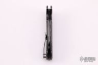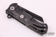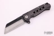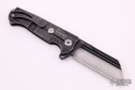 This ADV Butcher framelock flipper has a black tumble finished blade with false top edge, fuller and notched thumbrest and flipper. Has a black tumble finished titanium frame, backspacer, and tip up clip. Nice detent, lockup and blade seating. Comes with a nylon zippered case. Excellent Condition.