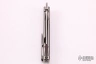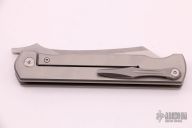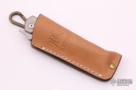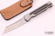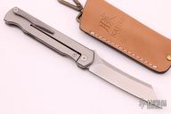 This front flipper by Katsu Knives features a stonewashed blade with front flipper. The handle has a bead blasted titanium frame with carbon fiber inlays and a titanium tip up clip. Comes with a leather sheath and original box. Excellent condition.