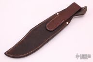 This Gunfighter Bowie by Lon Humphrey features a hand forged blade with satin finished grinds and forged finished flats, has false top edge, .235" blade stock and 1.831" blade depth, full tang construction. The handle has green canvas micarta scales with stainless steel pins and lanyard tube. Comes with a brown leather sheath. Has some light patina on the blade, otherwise excellent condition.