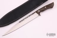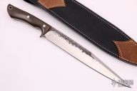 This Bell Bowie by Lon Humphrey features a hand forged blade with satin finished grinds and forged finished flats, has false top edge, .187" blade stock and 1.369" blade depth, full tang construction. The handle has green canvas micarta scales with stainless steel pins and lanyard tube. Comes with a black/brown leather sheath. Excellent condition.