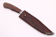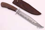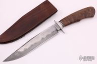 This Bowie by Journeyman Smith Shawn Ellis features a clip point blade with false top edge composed of stainless San Mai with a Damascus core. .272" Blade Stock and 1.405" blade depth, hidden tang construction. The handle has an 416 Stainless guard with a walnut grip. Comes with a brown leather sheath. Excellent condition.