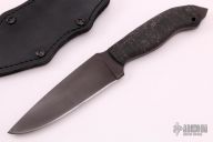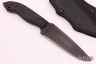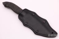A custom Kydex-lined black leather sheath comes with this knife and compliments the all-black fixed blade. The sheath allows for multiple carry positions and fixtures. A feature of the sheath is that the knife can be drawn with little to no noise. The sheath combines the best of leather and Kydex into a truly functional rig.