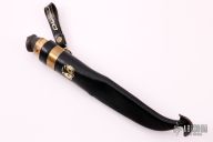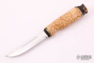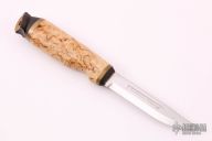 This knife from the well known European maker J Marttiini features a mirror polished scandi ground blade with fullers, .104" blade stock and .778" blade depth, hidden tang construction. The handle has a wood grip with brass guard and butt. Very utilitarian. Comes with a black leather sheath and original box. Excellent condition.
