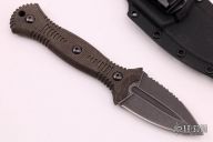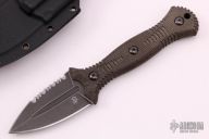 The Telum by Bastinelli Knives features a double edge blade with partial serrations and a mortise tang construction.  .126" Blade Stock.  1.349" Blade Depth.  The handle features green canvas micarta scales. Includes a kydex sheath with a Tracker Dan clip and display case. Excellent condition.