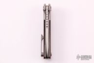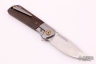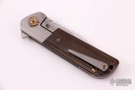 This Lanny is a Liong Mah design executed by Reate Knives. It features a two tone clip point blade with notched thumb rest, fullers and flipper. The handle is comprised of titanium bolsters and micarta scales titanium liners and backspacer with matching tip up clip that is reversible for left or right hand carry. Anodized titanium hardware and lanyard hole in pommel. Includes padded/zippered case. Excellent condition.