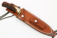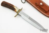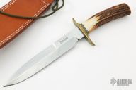 This Solingen Fighter by Randall Made Knives features a satin finished double-edged blade, .203" blade stock and 1.233" blade depth, hidden tang construction. The handle has a brass guard and stag grip with black/brass spacers. Comes with a brown leather sheath. Excellent condition. Hard to find. Stamped "W. Germany" on the back of the blade, but the stamp on this one is a little faint.