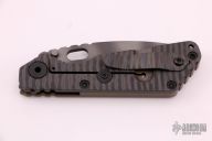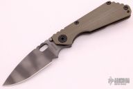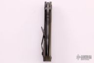 This SnG Hybrid CC by Strider Knives features a tiger striped blade and smooth green G-10 with a flame finished titanium frame and tip up clip. Notches on thumbrest, rear of handle, and lockup. Includes Hinderer "Lock Bar Stabilizer" for maximum reverse lock retention. Has black hardware. Excellent condition.