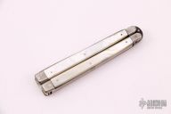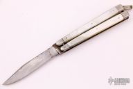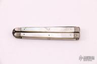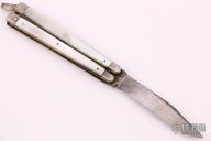 This Antique French balisong by Brevete SGDG features a satin finished blade. The handles have nickel silver bolsters, mother of pearl scales, brass liners. Has scuffs, scratches, cracks in the scales and patina, otherwise good condition for its age.