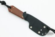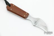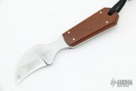 This Fruit Knife by Fred Perrin features a hawkbill blade with visible hamon, .123" blade stock and 1.009" blade depth, full tang construction. The handle is comprised of brown canvas micarta with nickel silver pins. Lanyard hole with lanyard in pommel. Includes kydex sheath. New from maker.