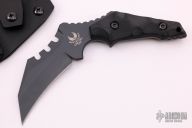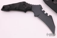 The Muninn by Bawidamann Blades is one bad-to-the-bone tactical blade. It features rippers on the top for gripping bone/cartilage, jimping near the butt end for thumb and index finger, as well as jimping on the spine for the palm. It's made from 0.178" thick CPM-Cruwear tool steel with a black Cerakote finish and durable full tang construction. The great handle ergonomics and design make this knife comfortable in both the forward and reverse grips. It's a simplistic, straightforward design that is purpose built for dangerous combat situations where a firearm may not be accessible. The knife ships in a boltaron sheath with PUP mounting attachment system and was proudly made in the USA.