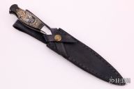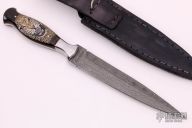 This piece by Gaetan Beauchamp features a Damascus double edged blade with .155" blade stock and 1.105" blade depth, full tang construction. The handle has dovetailed mirror polished stainless bolsters, buffalo horn scales with brown canvas micarta liners. The handle features scrimshaw by Beauchamp dated '18. Nicely contoured handle. Comes with black leather sheath. Excellent condition.
