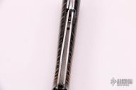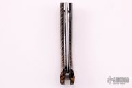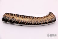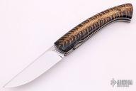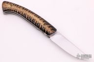 This knife by Manu LaPlace features a mirror polished blade. The handle has pine cone scales with black resin, stainless steel liners and backspacer. The inside of the backspacer is engraved "All is fair in love and war..." Comes with a leather slip sheath, original box and papers. Excellent condition.