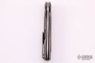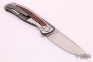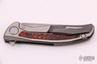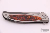 This F95R NL framelock flipper from Shirogorov has a flat ground tumble finished blade with notched thumbrest and flipper. The handle has a tumbled and milled titanium frame with Mars Valley carbon fiber inlays, bronze backspacer and titanium bead, tip up titanium clip with hidden screws. Excellent lockup, crisp detent, and perfect seating. MRBS. Knife comes in original box and COA. Excellent condition.