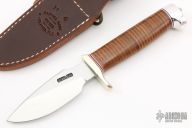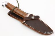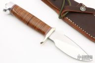 The Model 11 is the original drop-point blade. Designed by Tommy Thompson, noted Alaskan guide, in 1952 for big-game skinning, with point dropped below top of blade to prevent cutting too deeply through skins when used point first. This knife has a carbon steel blade with notched thumbrest, .163" blade stock and 1.265" blade depth, hidden tang construction. The handle has a nickel silver guard, duralumin butt, stacked leather grip with red/white/blue spacers. Comes with a brown leather sheath. Excellent condition.