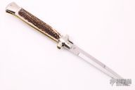 This large Swivel Bolster from A.G.A. Campolin features a mirror spear point blade with false top edge. The handle is comprised of nickel silver bolsters and pommel with stag scales over brass liners and stainless steel backspacer. Excellent condition. Comes with a zippered case.