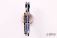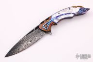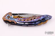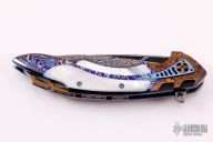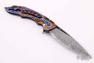 This Full Dressed framelock flipper by Ron Best is amazing. It features a Damasteel blade with textured cutout and a flipper. The handle has a timascus frame  with mother of pearl inlays, titanium pivot collars, timascus tip up clip, milled and 3-tone anodized titanium backspacer, and an anodized titanium lockbar with polished stainless steel lockface insert. Inside of backspacer reads "Ronald Best #47" Nice detent, lockup and blade seating. Comes with hard case. Excellent condition.