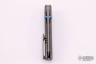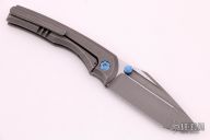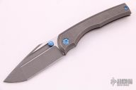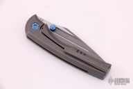 This BBM V2 by Nick Chuprin and Robert Carter features an acid-wash blade with titanium thumbstuds. The handle has a tumbled titanium frame with anodized titanium pivot, hardware and backspacer, and a tumbled titanium tip up clip with hidden screws. Rides on Skiff Made bearings, nice detent, lockup and blade seating. Comes with a zippered case. New from maker.